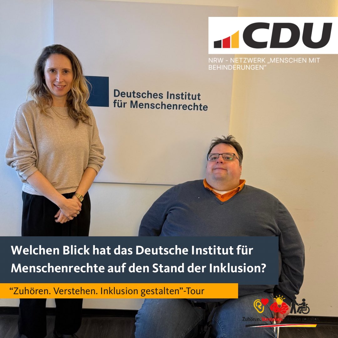 mehrMeine "Zuhören. Verstehen. Inklusion gestalten"-Tour ging in dieser Woche weiter ? und führte mich nach Berlin.Dort habe ich mich mit dem Deutsches Institut für Menschenrechte ausgetauscht. Mir war es besonders wichtig, die Perspektive aus menschenrechtlicher Sicht auf die Situation von Inklusion und Teilhabe in NRW mitzunehmen.Das Gespräch mit der Monitoring-Stelle für die UN-Behindertenrechtskonvention war sehr wertvoll und konstruktiv. Vielen Dank für den offenen Austausch!Ich freue mich auf den weiteren Dialog und die gemeinsame Arbeit für mehr Inklusion und echte Teilhabe. 💬🤝 #Inklusion #Teilhabe #Menschenrechte #NRW #cdu